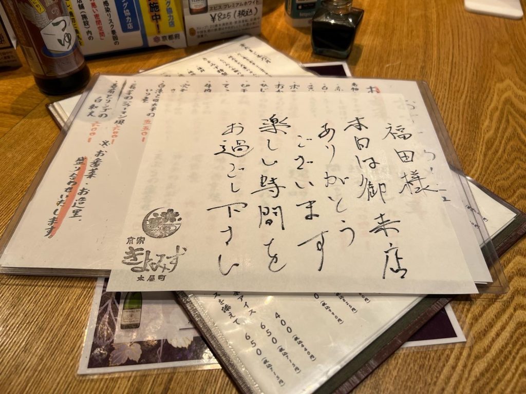 席に座ると真っ先に目に止まったものが、お店からのお手紙。